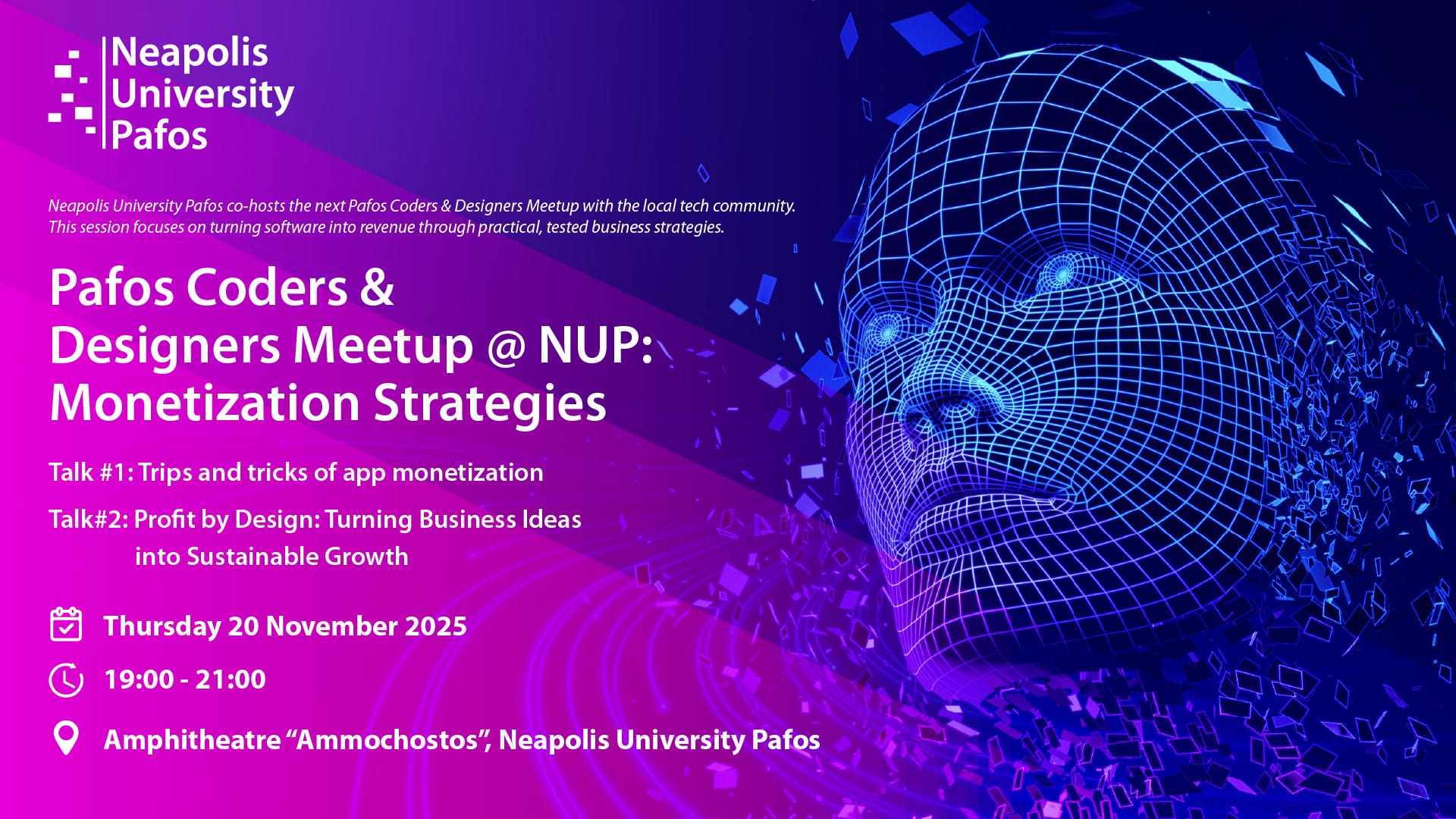 Neapolis University Pafos, in collaboration with the Pafos Coders and Designers community, will host the next Pafos Coders and Designers Meetup on Thursday, November 20, 2025, from 19:00 to 21:00 EEST at the Ammochostos Amphitheatre on the University campus.