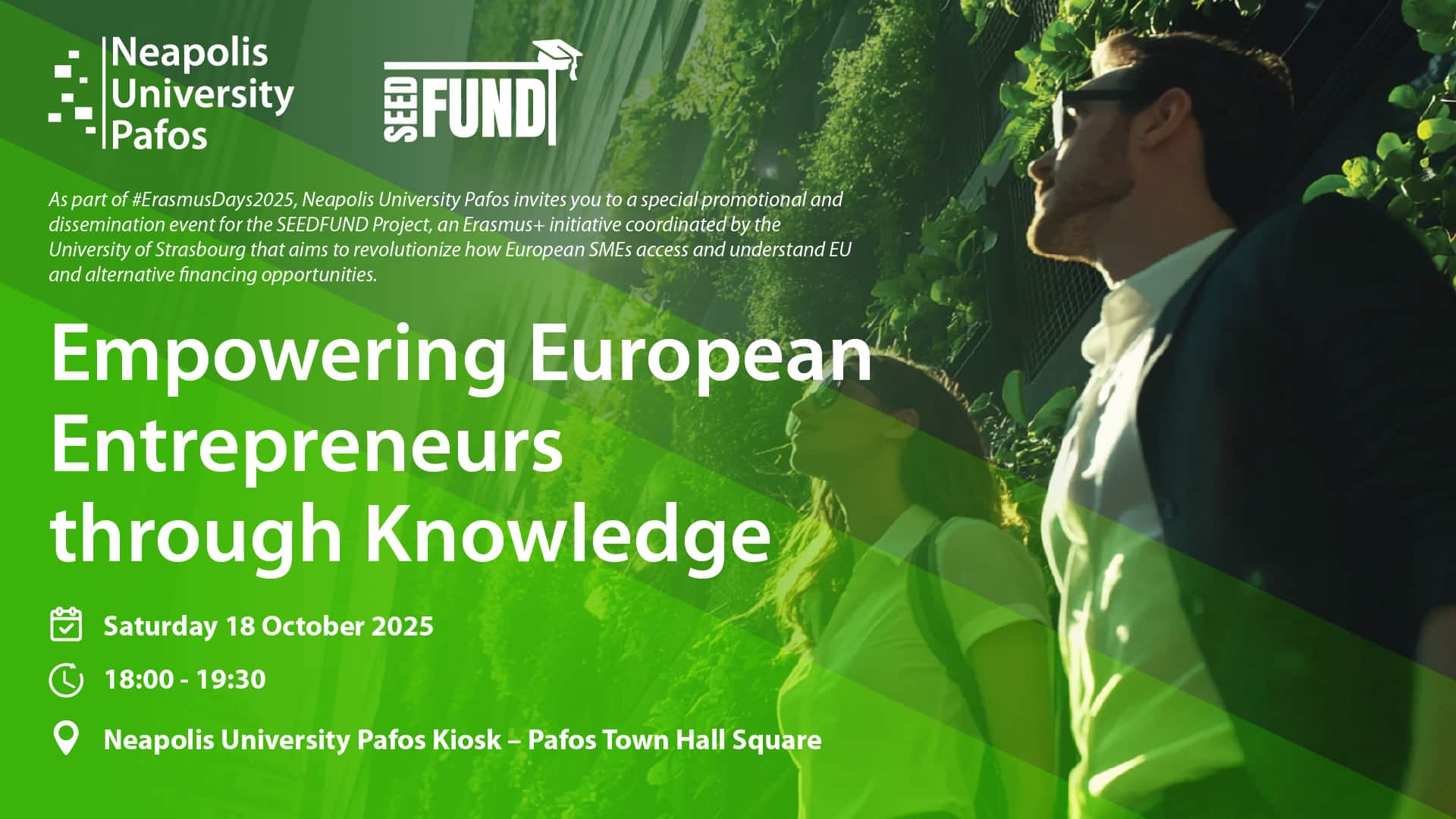 As part of the Erasmus Days 2025 celebrations, Neapolis University Pafos will host a dedicated event for the SEEDFUND Project on Saturday, 18 October 2025, from 18:00 to 19:30 at the University premises.