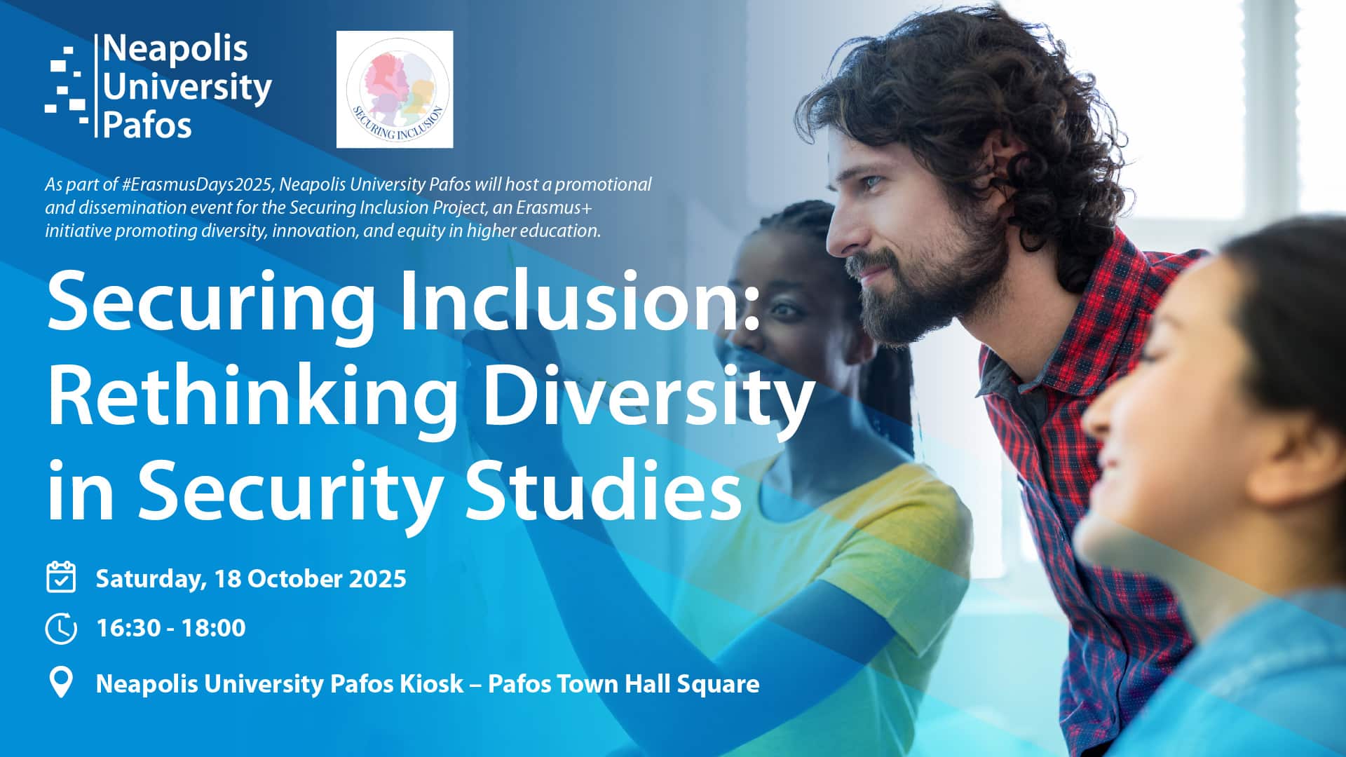 As part of the Erasmus Days 2025 celebrations, Neapolis University Pafos will hold a promotional and dissemination event for the Erasmus+ project “Securing Inclusion” on Saturday, 18 October 2025, from 16:30 to 18:00, at the Neapolis University Pafos kiosk in Pafos Town Hall Square.