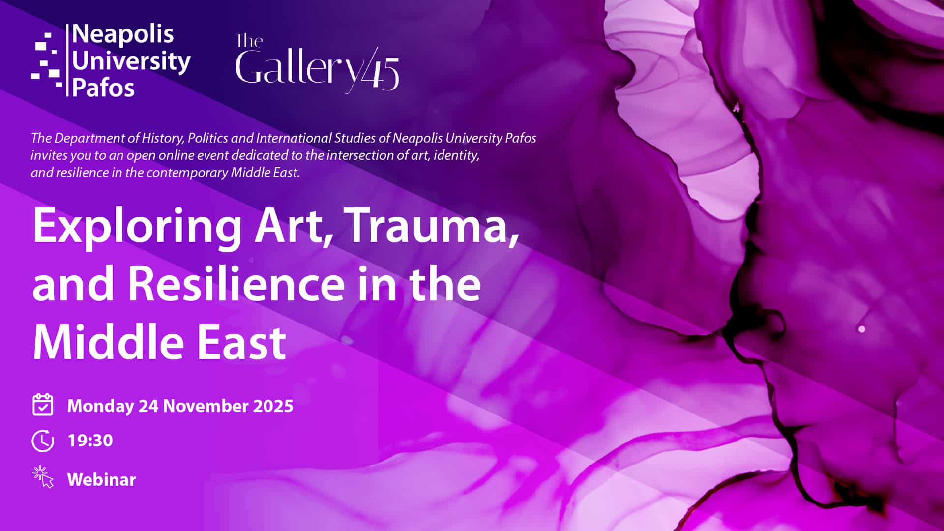 The Department of History, Politics and International Studies of Neapolis University Pafos announces the organisation of an open online event titled “Exploring Art, Trauma, and Resilience in the Middle East”, which will take place on Monday, 24 November 2025, at 19:30 via Microsoft Teams.
