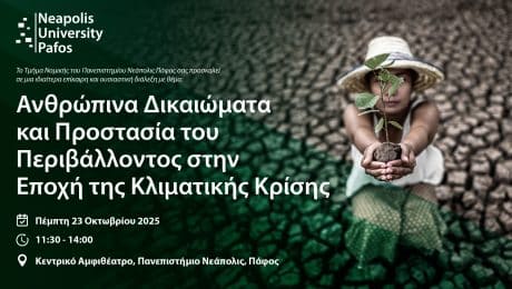 Το Τμήμα Νομικής του Πανεπιστημίου Νεάπολις Πάφος διοργανώνει την Πέμπτη, 23 Οκτωβρίου 2025, από 11:30 έως 14:00, στο Κεντρικό Αμφιθέατρο του Πανεπιστημίου, ανοιχτή διάλεξη με...