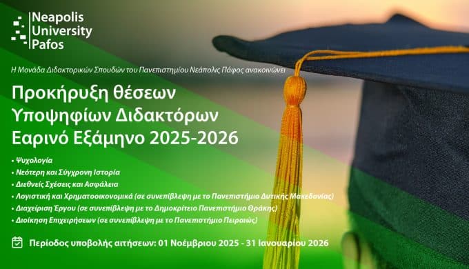 Η Μονάδα Διδακτορικών Σπουδών του Πανεπιστημίου Νεάπολις Πάφος (Neapolis University Pafos - NUP), ανακοινώνει νέα προκήρυξη περιορισμένων θέσεων Υποψηφίων Διδακτόρων (Υ.Δ.) για το Εαρινό Εξάμηνο...