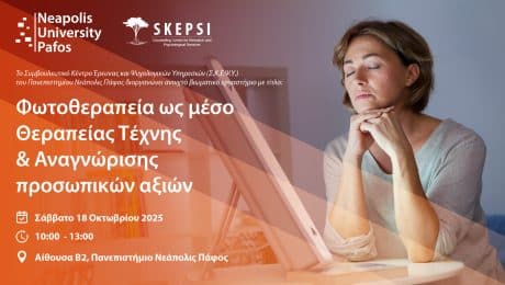 Το Συμβουλευτικό Κέντρο Έρευνας και Ψυχολογικών Υπηρεσιών (Σ.Κ.Ε.Ψ.Υ.) του Πανεπιστημίου Νεάπολις Πάφος διοργανώνει το Σάββατο 18 Οκτωβρίου 2025, από τις 10:00 έως τις 13:00, βιωματικό...