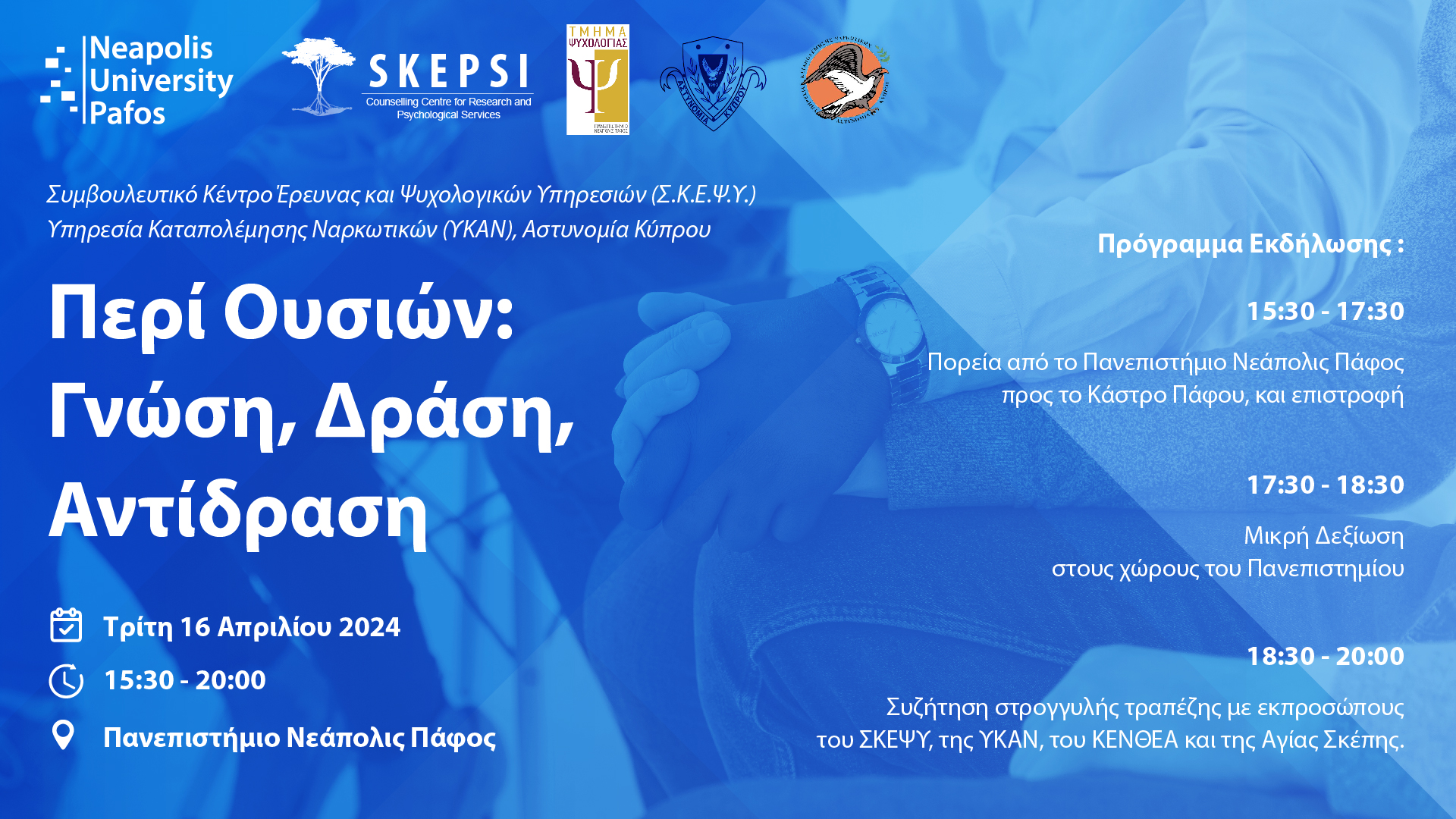Το Τμήμα Ψυχολογίας και το Συμβουλευτικό Κέντρο Έρευνας και Ψυχολογικών Υπηρεσιών (Σ.Κ.Ε.Ψ.Υ.) σε συνεργασία με την Υπηρεσία Καταπολέμησης Ναρκωτικών (ΥΚΑΝ) της Αστυνομίας Κύπρου διοργανώνουν ημερίδα ενημέρωσης κατά της χρήσης ναρκωτικών ουσιών με τίτλο “Περί Ουσιών: Γνώση, Δράση, Αντίδραση”.