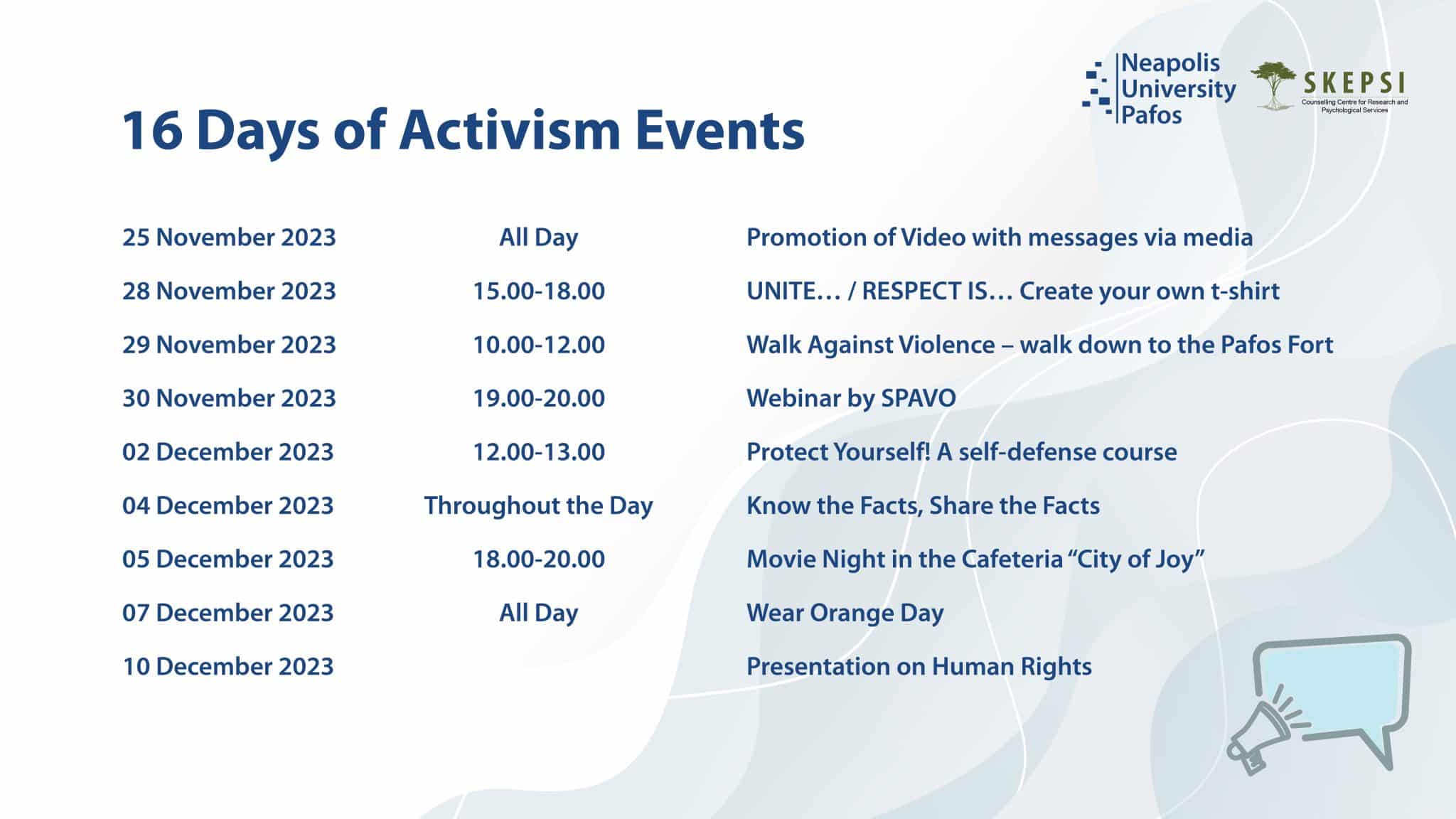 Η Παγκόσμια Εκστρατεία 16 Ημερών αντιπροσωπεύει μια ευκαιρία για όλους μας να συνεισφέρουμε στον αγώνα κατά της βίας. Μέσα από εκπαιδευτικές εκδηλώσεις, διαλέξεις και συναντήσεις, στοχεύουμε στη δημιουργία μιας κοινότητας που είναι πλήρως ενημερωμένη και δραστήρια για το ζήτημα αυτό.
