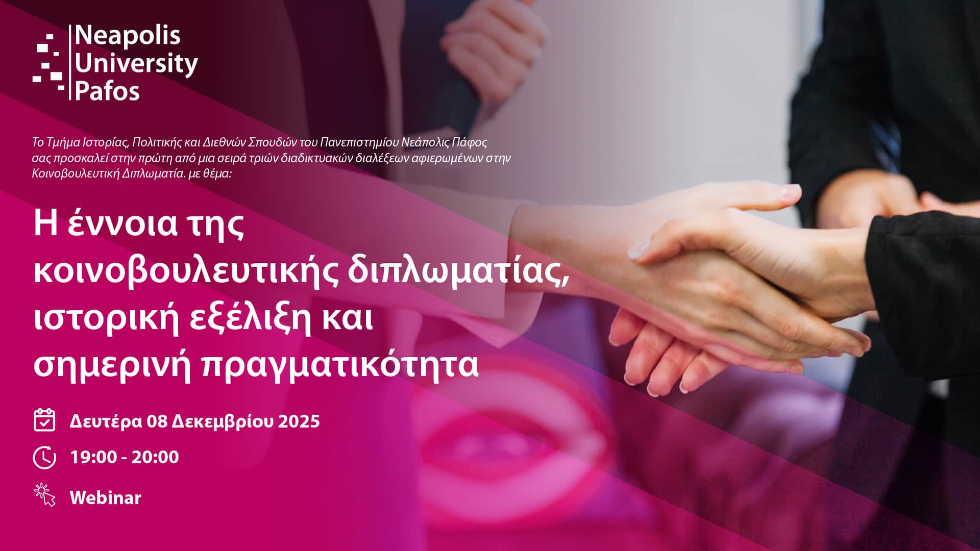 Το Τμήμα Ιστορίας, Πολιτικής και Διεθνών Σπουδών του Πανεπιστημίου Νεάπολις Πάφος διοργανώνει τη Δευτέρα, 8 Δεκεμβρίου 2025, από τις 19:00 έως τις 20:00, την πρώτη διαδικτυακή διάλεξη ενός κύκλου τριών τηλεδιαλέξεων αφιερωμένων στην Κοινοβουλευτική Διπλωματία.