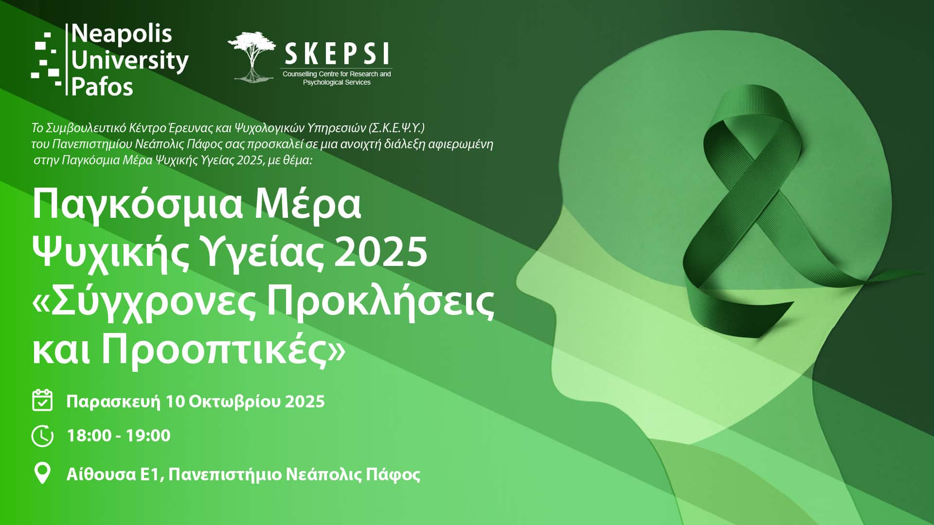 Με αφορμή την Παγκόσμια Μέρα Ψυχικής Υγείας 2025, το Συμβουλευτικό Κέντρο Έρευνας και Ψυχολογικών Υπηρεσιών (Σ.Κ.Ε.Ψ.Υ.) του Πανεπιστημίου Νεάπολις Πάφος διοργανώνει την Παρασκευή 10 Οκτωβρίου, από τις 18:00 έως τις 19:00, διάλεξη με θέμα «Σύγχρονες Προκλήσεις και Προοπτικές», στην Αίθουσα Ε1 του Πανεπιστημίου.
