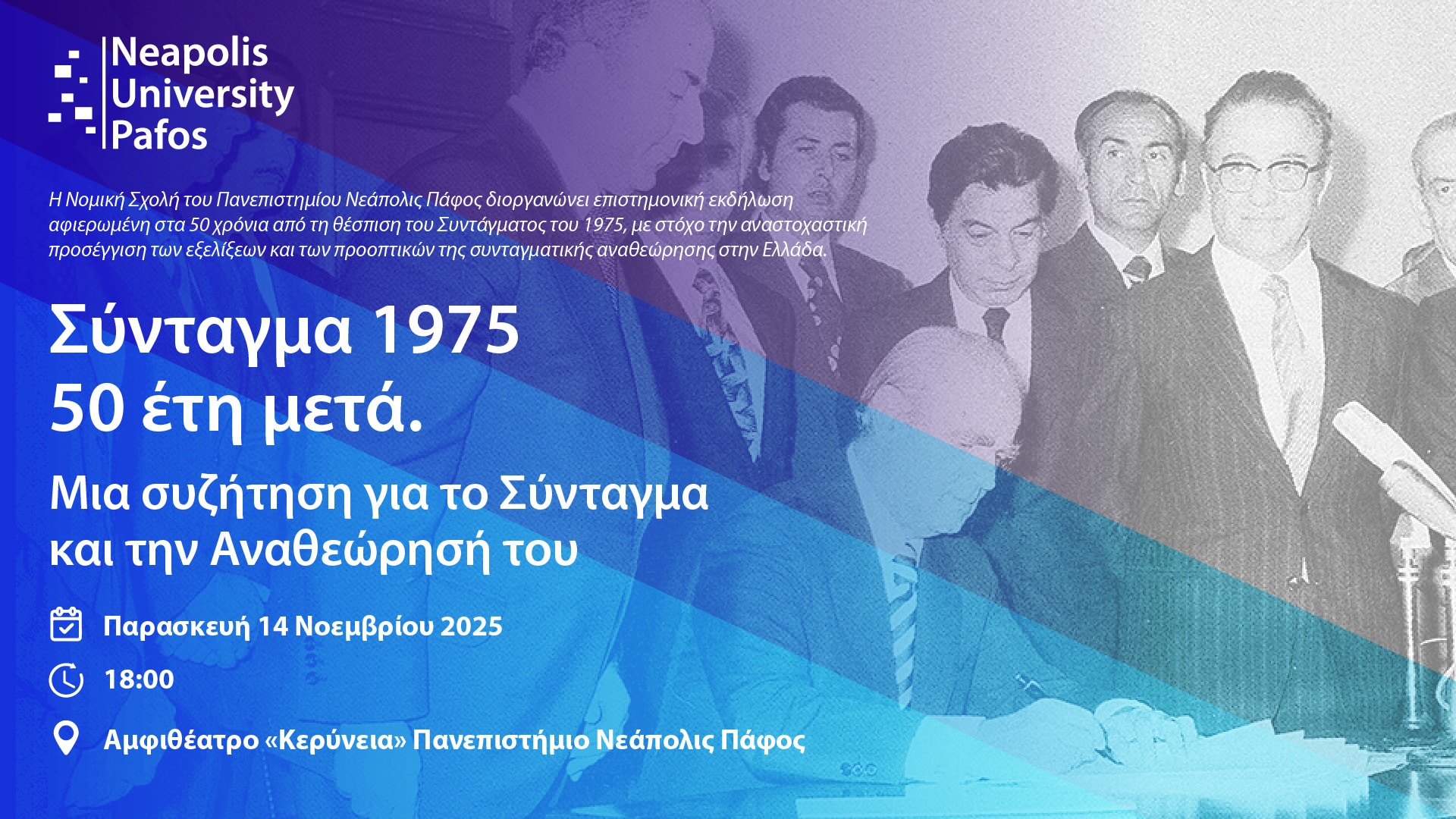 Η Νομική Σχολή του Πανεπιστημίου Νεάπολις Πάφος διοργανώνει την Παρασκευή, 14 Νοεμβρίου 2025, στις 18:00, στο Αμφιθέατρο «Κερύνεια» του Πανεπιστημίου, επιστημονική εκδήλωση με τίτλο «Σύνταγμα 1975 – 50 έτη μετά. Μια συζήτηση για το Σύνταγμα και την Αναθεώρησή του».