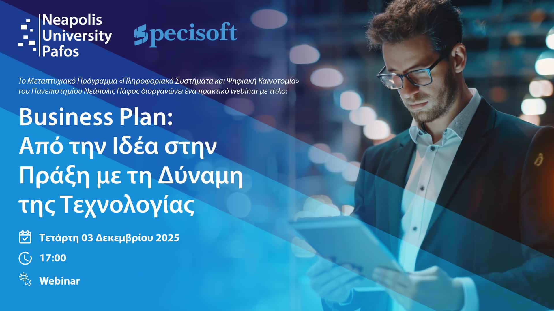 Το Μεταπτυχιακό Πρόγραμμα «Πληροφοριακά Συστήματα και Ψηφιακή Καινοτομία» του Πανεπιστημίου Νεάπολις Πάφος διοργανώνει την Τετάρτη, 3 Δεκεμβρίου 2025, στις 17:00, διαδικτυακό σεμινάριο (webinar) με τίτλο «Business Plan – Από την Ιδέα στην Πράξη με τη Δύναμη της Τεχνολογίας», στο πλαίσιο των δράσεων εξωστρέφειας και σύνδεσης του προγράμματος με τον επιχειρηματικό και τεχνολογικό κόσμο.