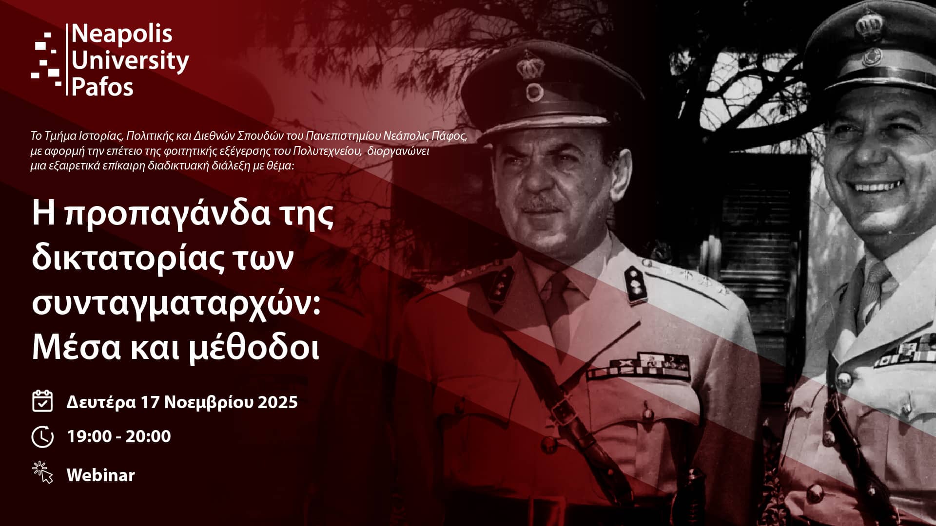 Το Τμήμα Ιστορίας, Πολιτικής και Διεθνών Σπουδών του Πανεπιστημίου Νεάπολις Πάφος, στο πλαίσιο των δράσεών του για την ενίσχυση του δημόσιου διαλόγου γύρω από τη σύγχρονη ιστορία και την πολιτική συνείδηση, διοργανώνει διαδικτυακή διάλεξη με τίτλο «Η προπαγάνδα της δικτατορίας των συνταγματαρχών: Μέσα και μέθοδοι», τη Δευτέρα, 17 Νοεμβρίου 2025, στις 19:00.