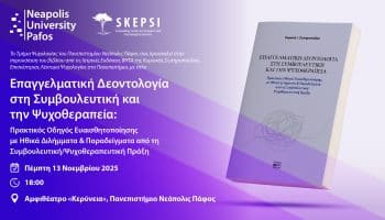 Το Τμήμα Ψυχολογίας του Πανεπιστημίου Νεάπολις Πάφος διοργανώνει την παρουσίαση του νέου βιβλίου της Κυριακής Σωτηροπούλου, Επισκέπτριας Λέκτορα Ψυχολογίας, με τίτλο: «Επαγγελματική Δεοντολογία στη Συμβουλευτική...