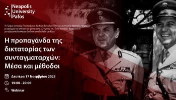 Διαδικτυακή Διάλεξη: «Η προπαγάνδα της δικτατορίας των συνταγματαρχών: Μέσα και μέθοδοι» Το Τμήμα Ιστορίας, Πολιτικής και Διεθνών Σπουδών του Πανεπιστημίου Νεάπολις Πάφος σας προσκαλεί σε...