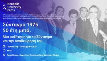 Η Νομική Σχολή του Πανεπιστημίου Νεάπολις Πάφος διοργανώνει την Παρασκευή, 14 Νοεμβρίου 2025, στις 18:00, στο Αμφιθέατρο «Κερύνεια» του Πανεπιστημίου, επιστημονική εκδήλωση με τίτλο «Σύνταγμα...