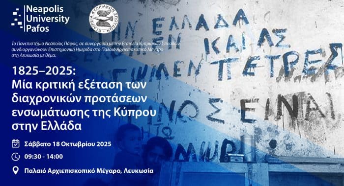 Το Πανεπιστήμιο Νεάπολις Πάφος, σε συνεργασία με την Εταιρεία Κυπριακών Σπουδών, συνδιοργανώνουν Επιστημονική Ημερίδα στο Παλαιό Αρχιεπισκοπικό Μέγαρο στη Λευκωσία, το Σάββατο 18 Οκτωβρίου 2025...