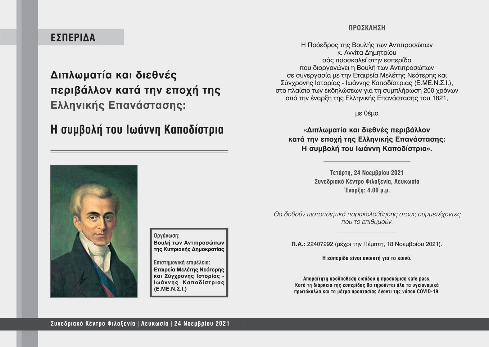 Ο κ. Γεωργής την Τετάρτη, 24 Νοεμβρίου 2021 ήταν ένας από τους ομιλητές στην Εσπερίδα της Βουλής των Αντιπροσώπων σε συνεργασία με την Εταιρεία Μελέτης Νεότερης και Σύγχρονης Ιστορίας – Ιωάννης Καποδίστριας (Ε.ΜΕ.Ν.Σ.Ι.) με θέμα: