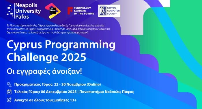 Το Πανεπιστήμιο Νεάπολις Πάφος, σε συνεργασία με τον Cyprus Computer Society, ανακοινώνει τη διοργάνωση του 3ου Cyprus Programming Challenge 2025, μιας πανκυπριακής ολυμπιάδας προγραμματισμού που...