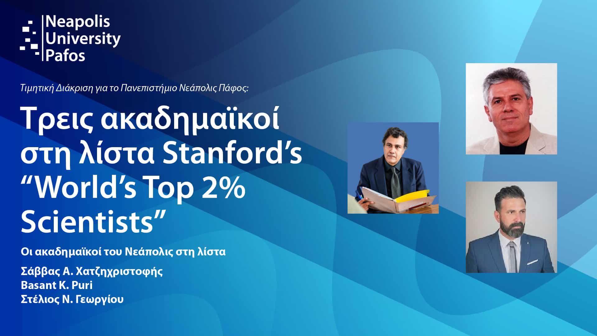 Το Πανεπιστήμιο Νεάπολις Πάφος ανακοινώνει ότι τρεις ακαδημαϊκοί του περιλαμβάνονται στη διεθνώς αναγνωρισμένη λίστα Stanford’s World’s Top 2% Scientists (2025), η οποία συντάσσεται σε συνεργασία με την Elsevier και δημοσιεύεται από την ερευνητική ομάδα του Καθηγητή John Ioannidis. Η διάκριση αυτή επιβεβαιώνει την παγκόσμια επιρροή του ερευνητικού έργου τους.