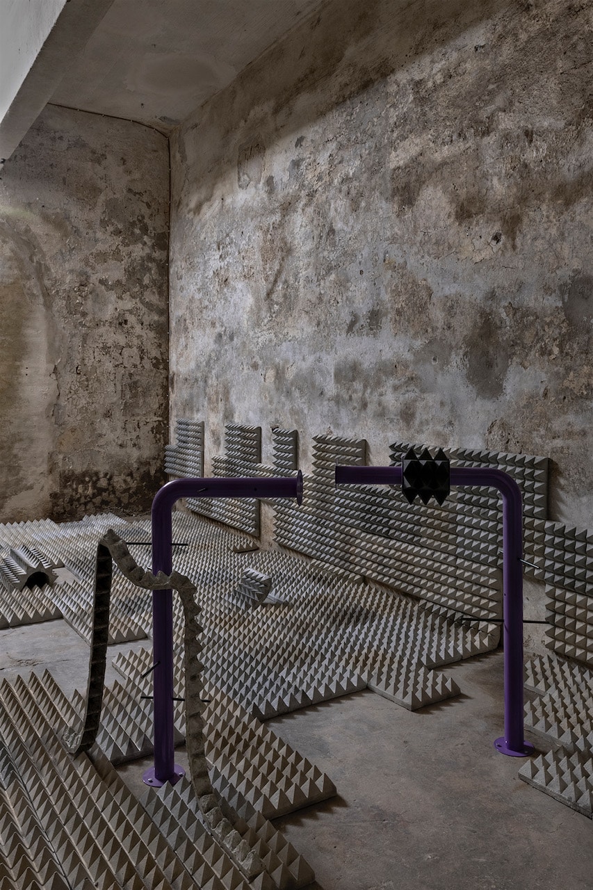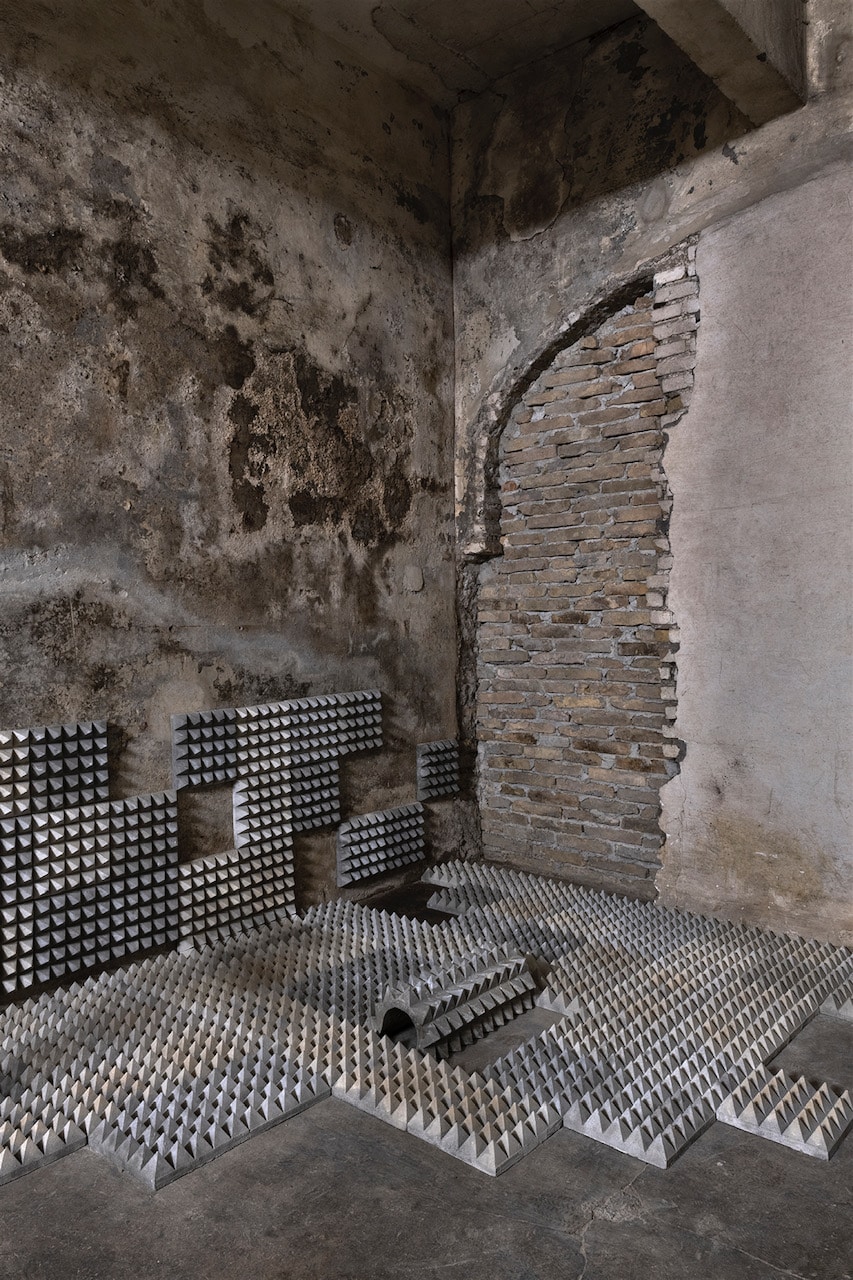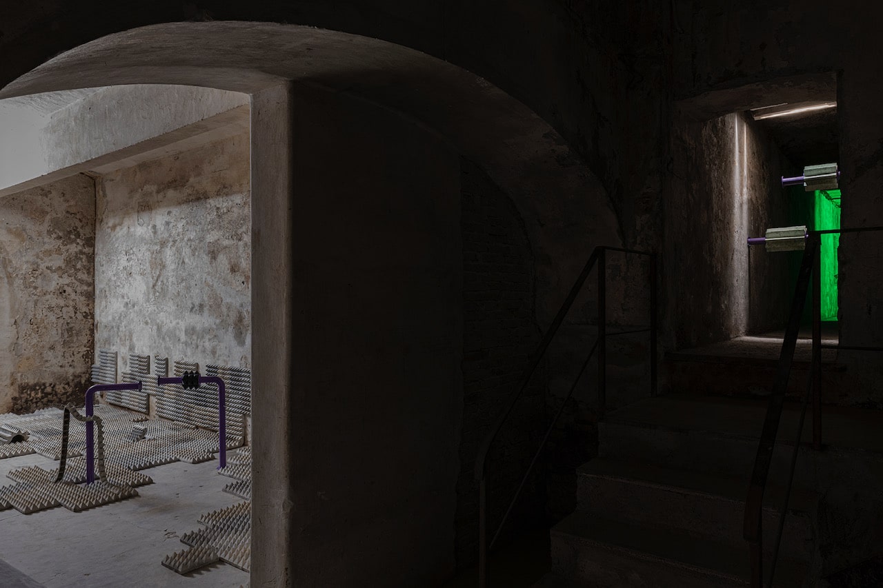 The project – conceived for Spazio Molini as a site-specific intervention – investigates the apparent familiarity of the motifs and patterns of public space, activating a critical enquiry into the theme of hostile architecture, understood as an expression of a “paranoid and anxious” (Robert Park) design that conflicts with the bodily experience of individuals in urban space, compromising their personal and political freedoms.
