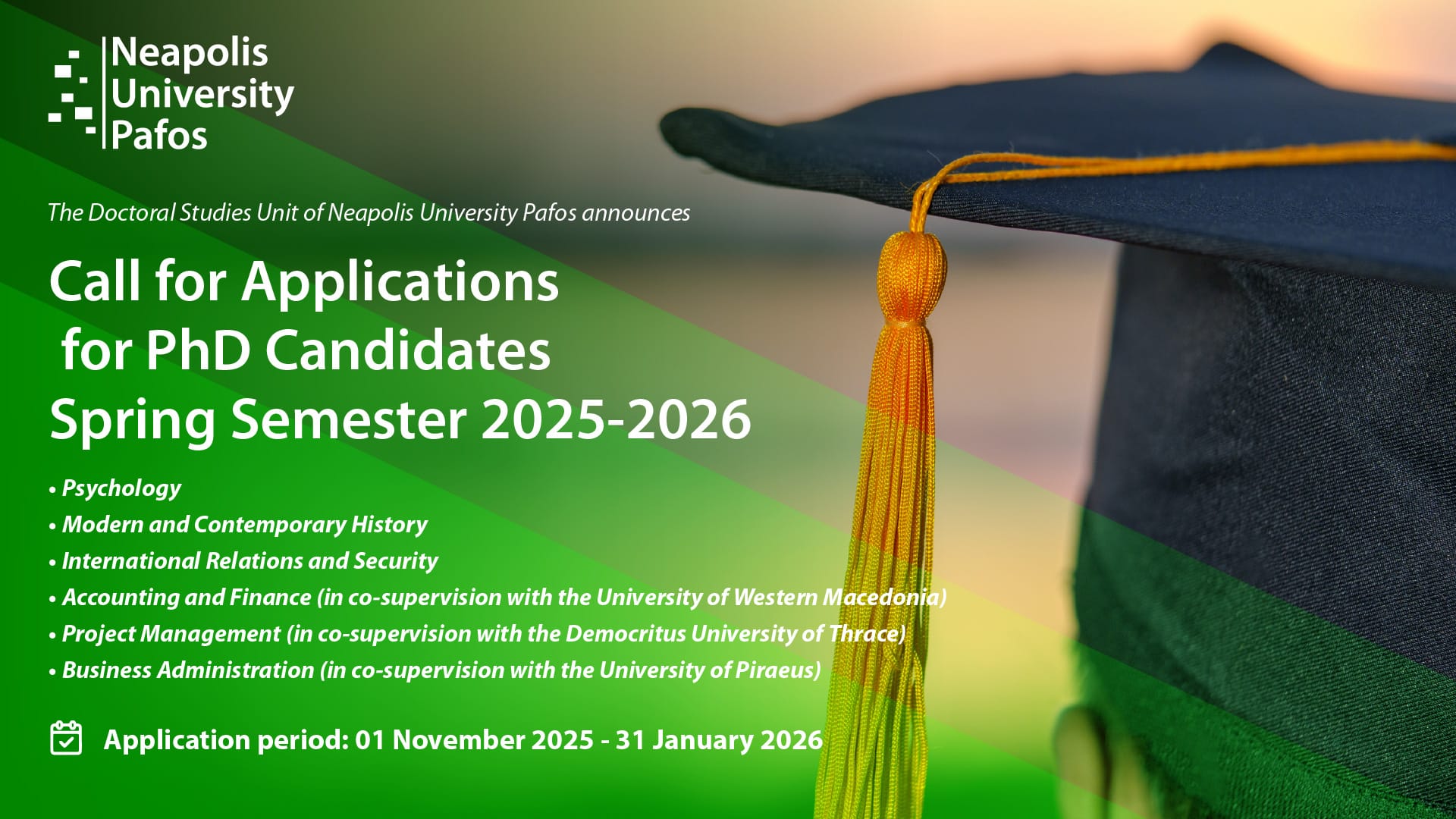 The Doctoral Studies Unit of Neapolis University Pafos (NUP) announces the opening of a limited number of positions for Doctoral Candidates for the Spring Semester 2025–2026. The application period will run from Saturday, 1 November 2025, to Saturday, 31 January 2026.