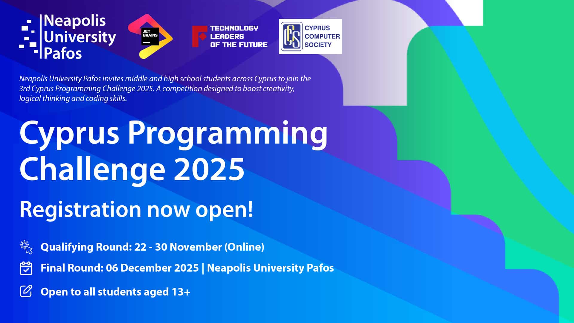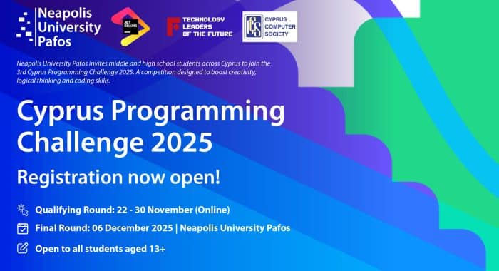 Neapolis University Pafos, in collaboration with the Cyprus Computer Society, announces the organization of the 3rd Cyprus Programming Challenge 2025, a nationwide programming olympiad for middle and high school students across Cyprus. The initiative aims to strengthen analytical thinking, creativity and technological skills through a modern and demanding competition experience.
